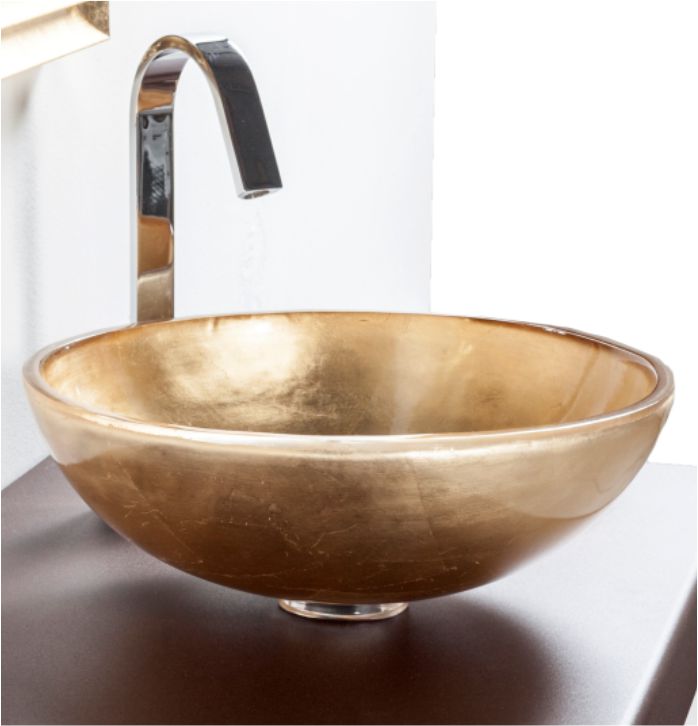 Lavatório de pousar. Resina transparente com folha metálica no interior.